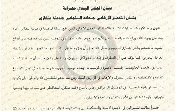 تقدم المجلس البلدي مصراتة اليوم الاربعاء بأحر التعازي لذوي شهداء تفجير بنغازي، مؤكداً ان الإنقسام السياسي والمؤسساتي ساهم في تردّي الاوضاع الأمنية.