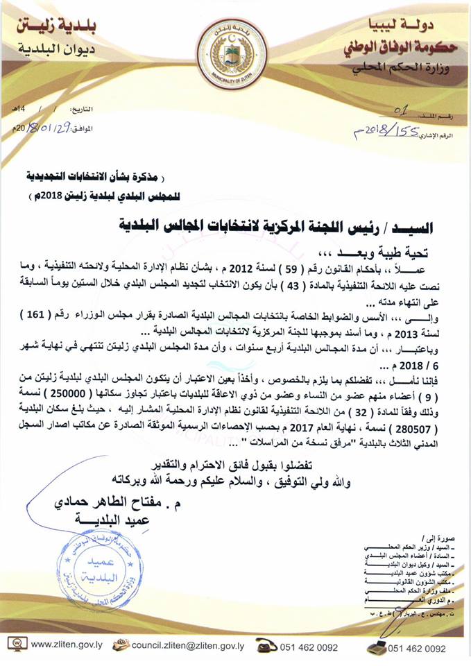 وقد وجه عميد بلدية زليتن مفتاح حمادي صباح اليوم، مراسلة إلى اللجنة المركزية للانتخابات مجالس البلدية، وتلقت صحيفة أصوات نسختة منها، موضحاً فيها ان عدد سكان بلدية زليتن تجاوز 250000 نسمة، وذلك وفقاً للمادة 32 من اللائحة التنفيذية لقانون نظام الادارة المحلية.