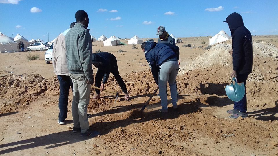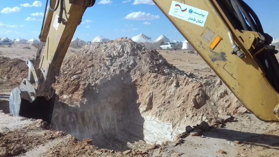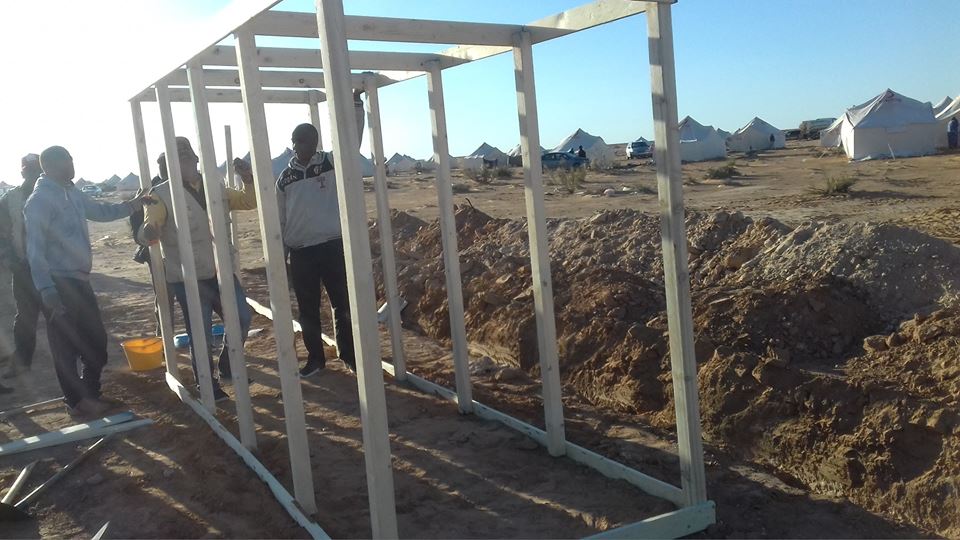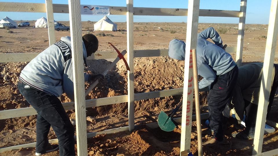 تقوم منظمة اليونيسف ببناء دورات مياه لحوالي 200 أسرة نازحة من تاورغاء والمتواجدين في مخيم مؤقت بمنطقة قرارة القطف بالقرب من بني وليد.