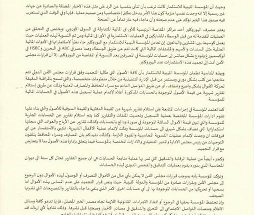 وأكدت المؤسسة خلال بيانها ”تعتمد المؤسسة في إجراءات المتابعة على استلام تقارير شهرية عن القيمة الدفترية والقيمة السوقية للأصول والتي بناء عليها تقوم ادارات المؤسسة المختصة بعملية التسجيل وتحديث الملفات والتقارير كما يتم استلام تقارير عن الحسابات الجارية للمؤسسة والتي تبين قيمة الأموال السائلة الموجودة في صورة ودائع بالحسابات وكذلك تقارير عن الأرباح والعوائد التي سجلتها استثماراتها التي تضاف بشكل شهري الى حسابات المؤسسة وذلك لإتمام عملية الاقفال الشهرية، تنتهي بالاستفسار عن اي فروقات ان وجدت لإتمام عمليات التسوية المحاسبية والقيود اللازمة. وكذلك نفيدكم بان المصارف ومدراء المحافظ يتلقون التوجيهات من رئيس مجلس الادارة والمدير التنفيذي والادارات المختصة فيما يتعلق بإدارة هذه الأصول بما لا يتعارض مع قرار التجميد“