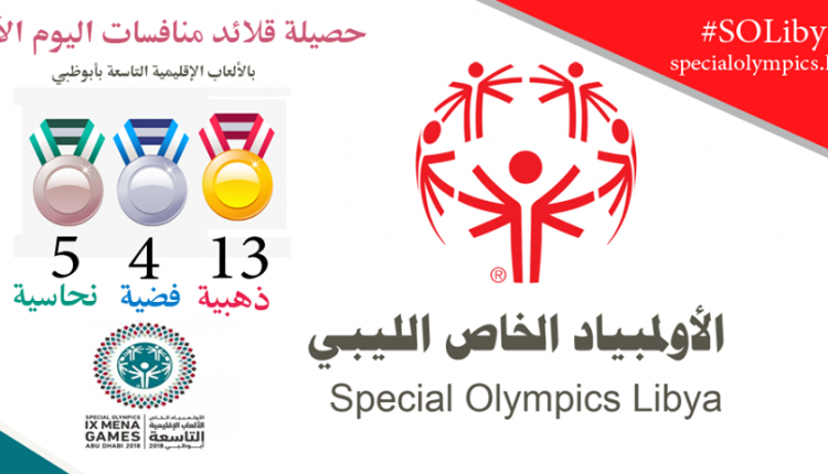 سجلت البعثة الليبية المشاركة في فعاليات الألعاب الإقليمية التاسعة للأولمبياد الخاص بالشرق الأوسط وشمال إفريقيا المقامة بأبوظبي الإماراتية، بداية متميزة بإحرازها 13 ميدالية ذهبية و 4 فضيات و 5 نحاسيات.