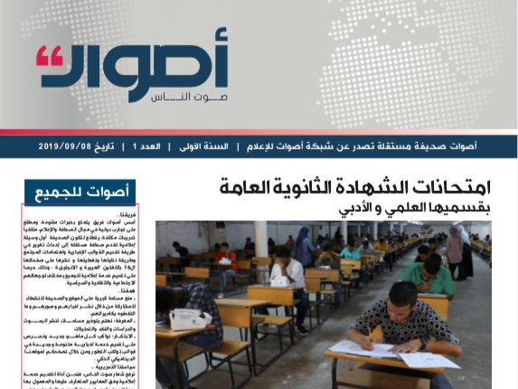 تصفح العدد الأول من صحيفة أصوات الصحيفة الورقية بواسطة aswat اخر تحديث سبتمبر 13, 2019 0 مصدر الصورة | صحيفة أصوات 0 مشاركة