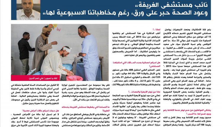 رغم قلة الامكانيات وضعف التجهيزات يواصل مستشفى الغريفة القروي تقديم خدماته لأكثرمن 15 ألف مواطن من سكان المنطقة وحتى المناطق المجاورة منذ تشييده قبل حوالي 23 سنة ..ما أهم النواقص وكم نسبة الاحتياج سواء على صعيد المعدات أو على صعيد الأطقم الطبية ، و ما الاقسام و الخدمات التي يقدمها مستشفى الغريفة القروي؟ من داخل هذا المستشفى التقى مراسل جريدة أصوات المدير المساعد السيد “محمد امحم”د و الذي تحدث في البداية قائلا: