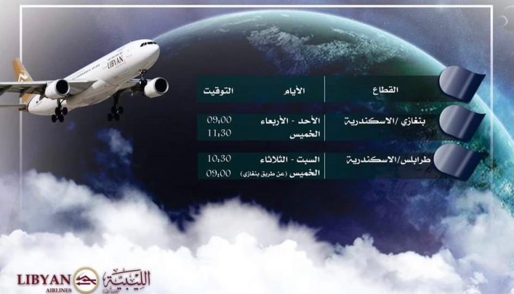و بالتواصل مع مدير مكتب الإعلام بالخطوط الليبية “محمد قنيوة” أوضح تم إعداد جدول للرحلات، حيث حدد الأيام الأحد و الأربعاء والخميس لتكون الرحلة من بنغازي إلى الإسكندرية بينما ستكون من طرابلس إلى الإسكندرية أيام السبت والثلاثاء.