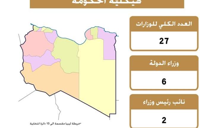 كشف مكتب اعلام رئيس حكومة الوحدة الوطنية “عبدالحميد الدبيبة” عن هيكلية الحكومة المتكونة من (27 حقيبة وزارية) التي ستُعرض على أعضاء مجلس النواب يوم الأثنين القادم في جلسة منح الثقة المزمع انعقادها بمدينة سرت.