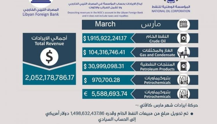 كشفت المؤسسة الوطنية للنفـط عن الإيراد العام من مبيعات النفط الخام والغاز والمكثفات والمنتجات النفطية والبتروكيماويات والتي سجلت مستوى 2,052,178,786.17 دولار امريكي عن شهر مارس للعام 2021م.