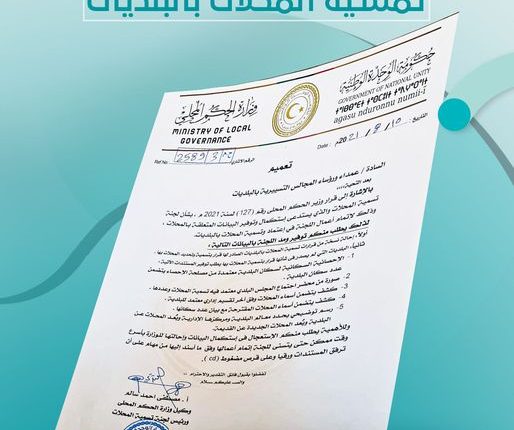 دعت وزارة الحكم المحلي عمداء و رؤساء المجالس التسييرية بالبلديات على مستوى ليبيا، لضرورة الإسراع في توفير البيانات الخاصة بالمحلات التابعة لها .