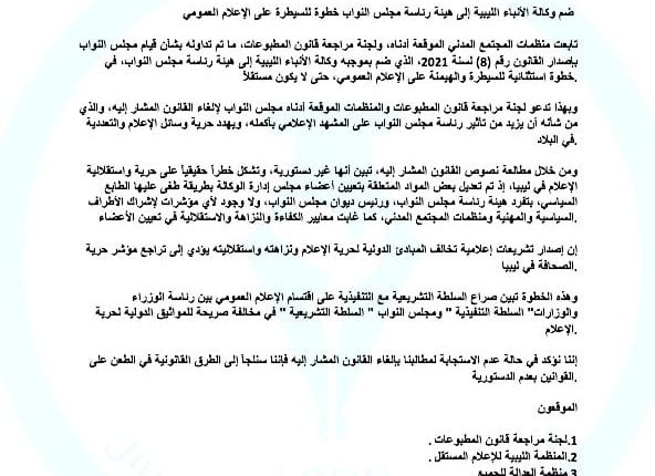 دعت 9 منظمات مجتمع مدني مهتمة بالاعلام وحرية التعبير وسيادة القانون ، ولجنة مراجعة قانون المطبوعات ، مجلس النواب لإلغاء القانون رقم(8) لسنة2021 القاضي بضم وكالة الانباء الليبية إليه.