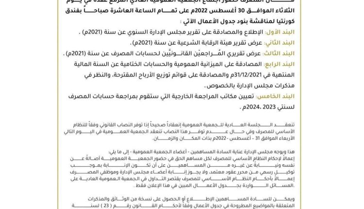إعمـــــــــــــالاً بأحكــــــــام النظام الأســـــــــــاسي للمصرف يقتصر التداول في الـجمعية الــعمومية العادية على المســـــــــائل الـــــــــــــــــــــواردة بجــــــــــــــــدول الأعمــــــــــــــال المبين في هذا الإعلان فقط.
